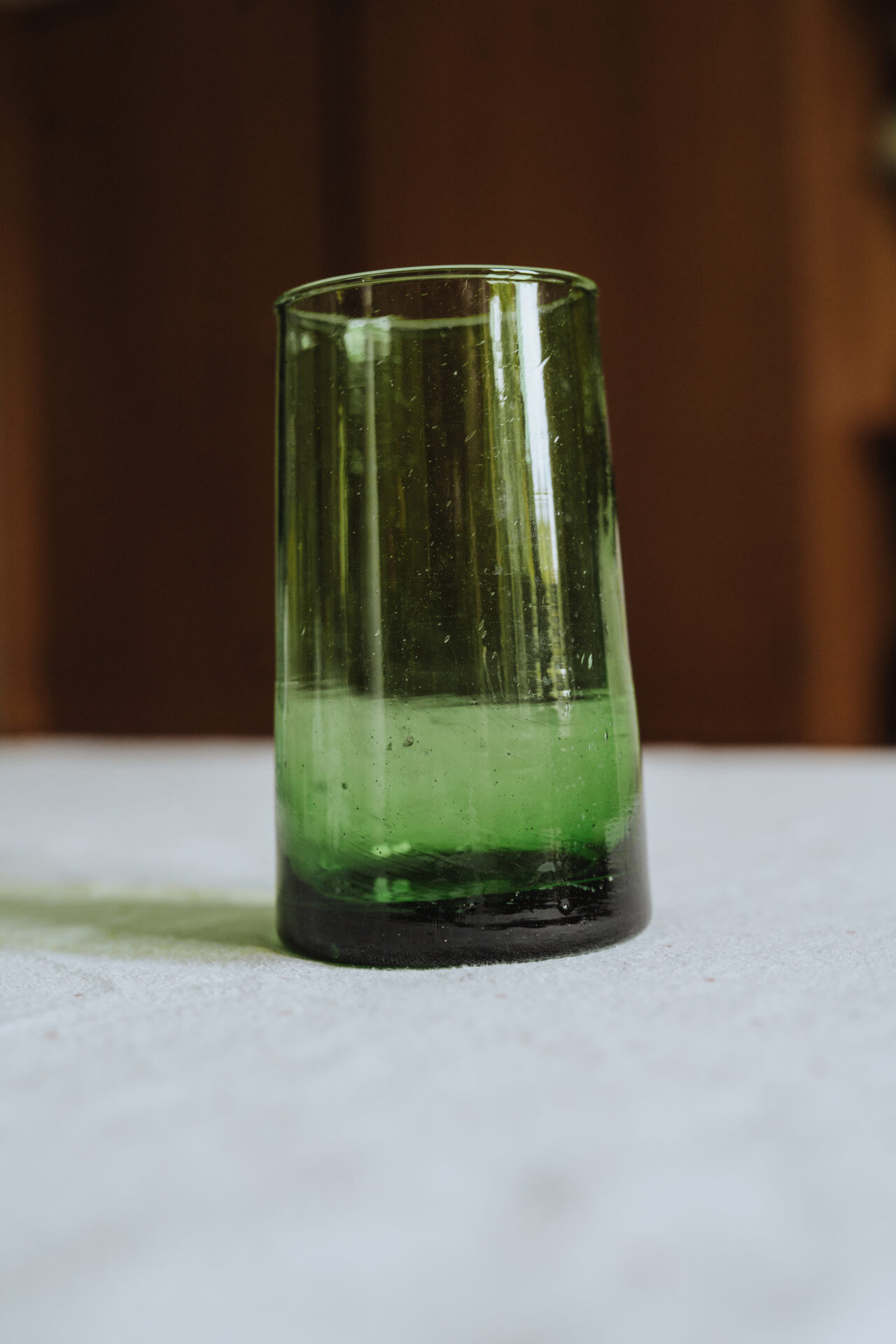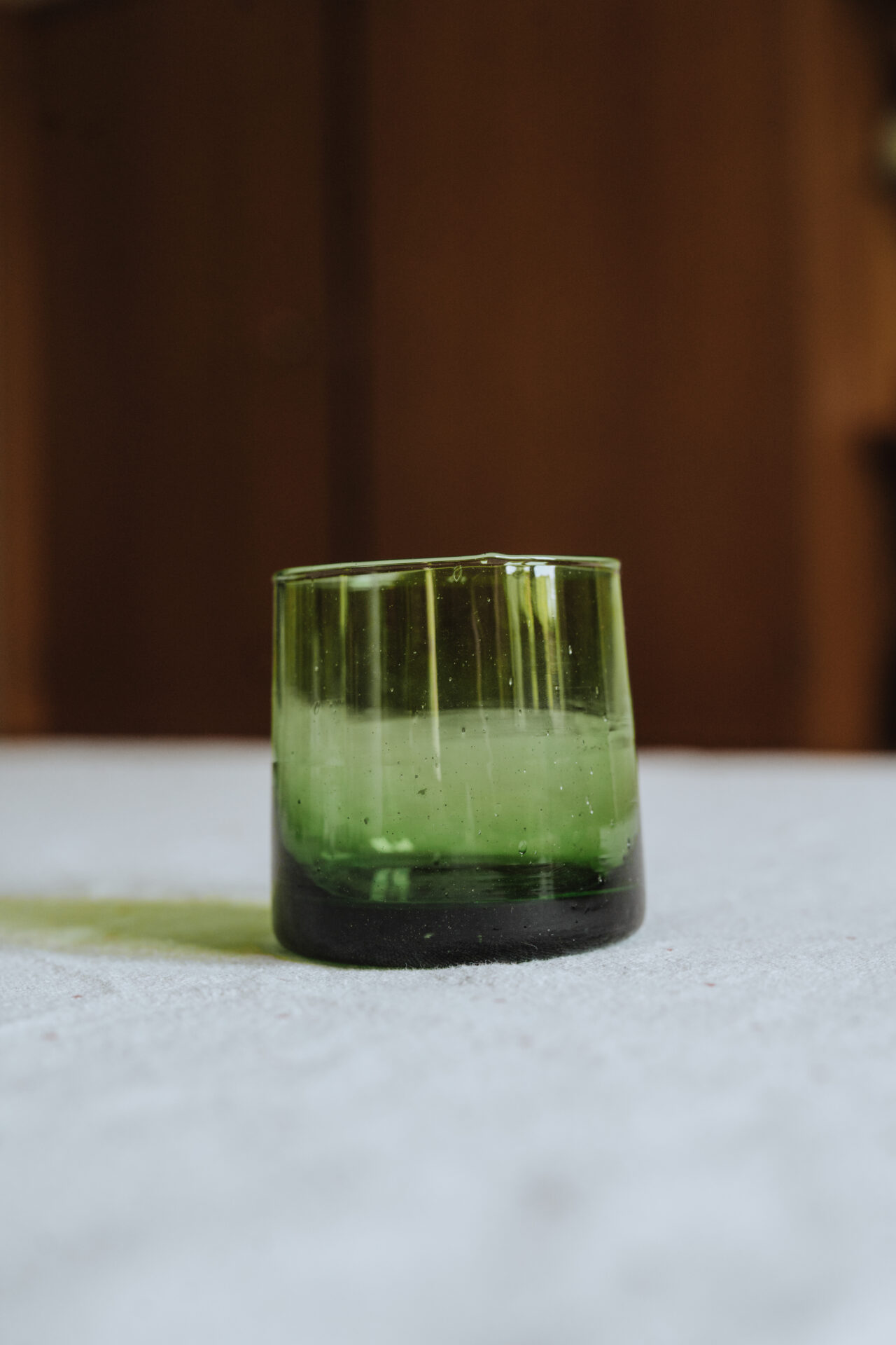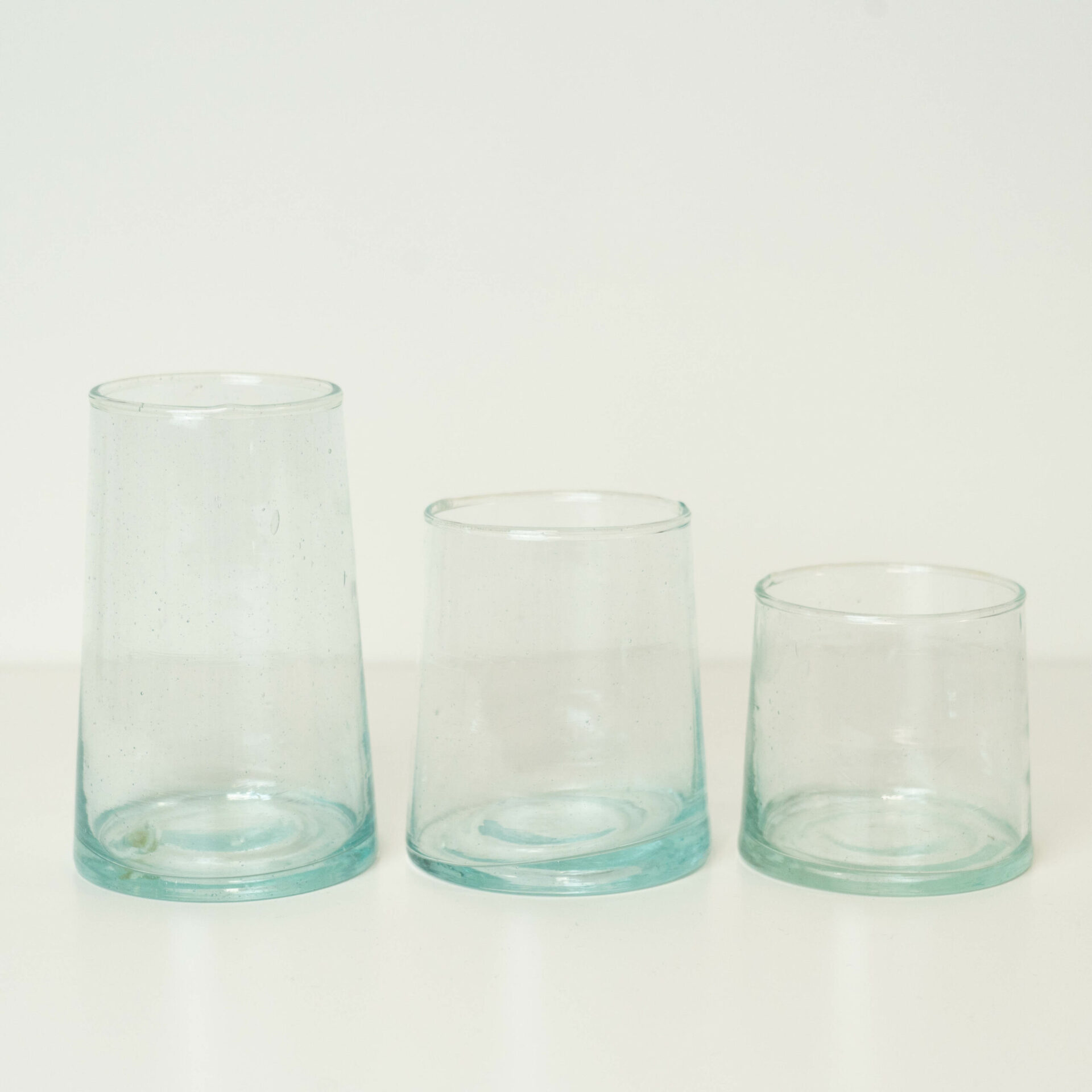Les bulles d’air emprisonnées dans le verre et les légères variations de forme ou de taille créent une esthétique organique et rustique. Elles rappellent l’artisanat traditionnel et le travail artisanal réalisé avec soin par les artisans marocains. Ces imperfections donnent aux verres une allure artisanale et une beauté unique qui les distinguent des verres industriels plus uniformes.
